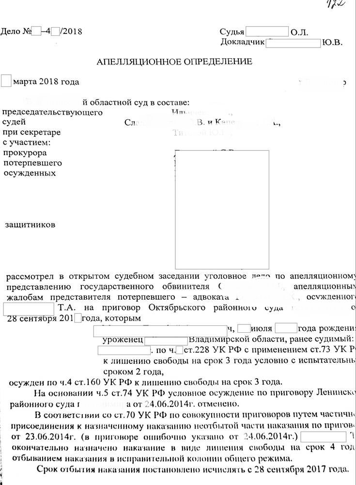 Изучив приговор и материалы уголовного дела, действуя в процессуальном статусе представителя потерпевшего, мною были выявлены существенные нарушения норм уголовного и уголовно-процессуального закона. Согласовав позицию с потерпевшим, в установленные законом сроки была подана апелляционная жалоба.